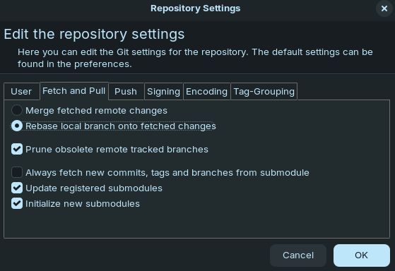 Wichtig ist jetzt noch, dass du in deiner Git-GUI einstellst, dass das Standardverhalten bei Pulls Rebase ist. Dazu musst du deine Git-Config ändern. Das geht meist über ein Einstellungsmenü. In SmartGit über Repository/Settings und dann sollte es so aussehen: